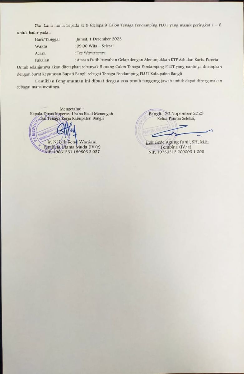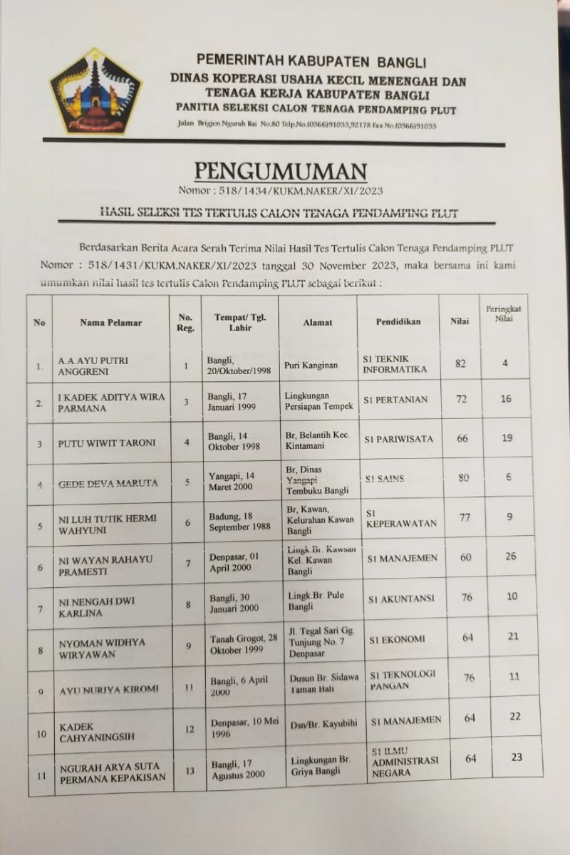 PENGUMUMAN HASIL TES TERTULIS CALON TENAGA PENDAMPING PLUT